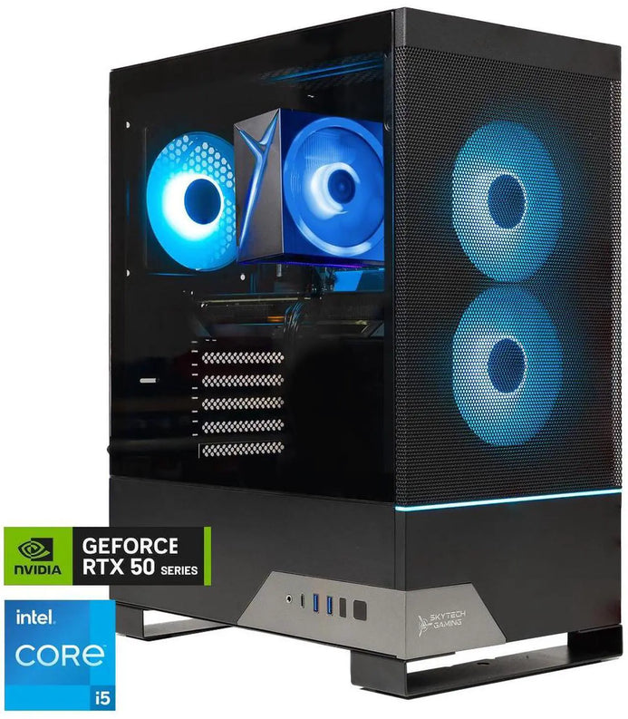 - 2.5GHz Intel Core i5-14400F CPU Processor (4.7GHz Turbo Boost) | 1TB NVMe M.2 SSD Up to 30x Faster than Traditional HDD | High-Performance Air Cooler NVIDIA GeForce RTX 5050 8GB Graphics Card (Brand May Vary) | 16GB DDR5 6000 RAM Gaming Memory with Heat Spreader | Windows 11 Home 64-bit 802.11 AC | No Bloatware | Graphics output options include 1 x HDMI and 1 x Promised Display Port. Additional ports may vary. | USB ports including Gen1 2.0, 3.0, and 3.2 ports | HD Audio and Microphone | Complimentary Gaming Keyboard and Mouse | 1-Year Parts and Labor Warranty | Assembled in the USA