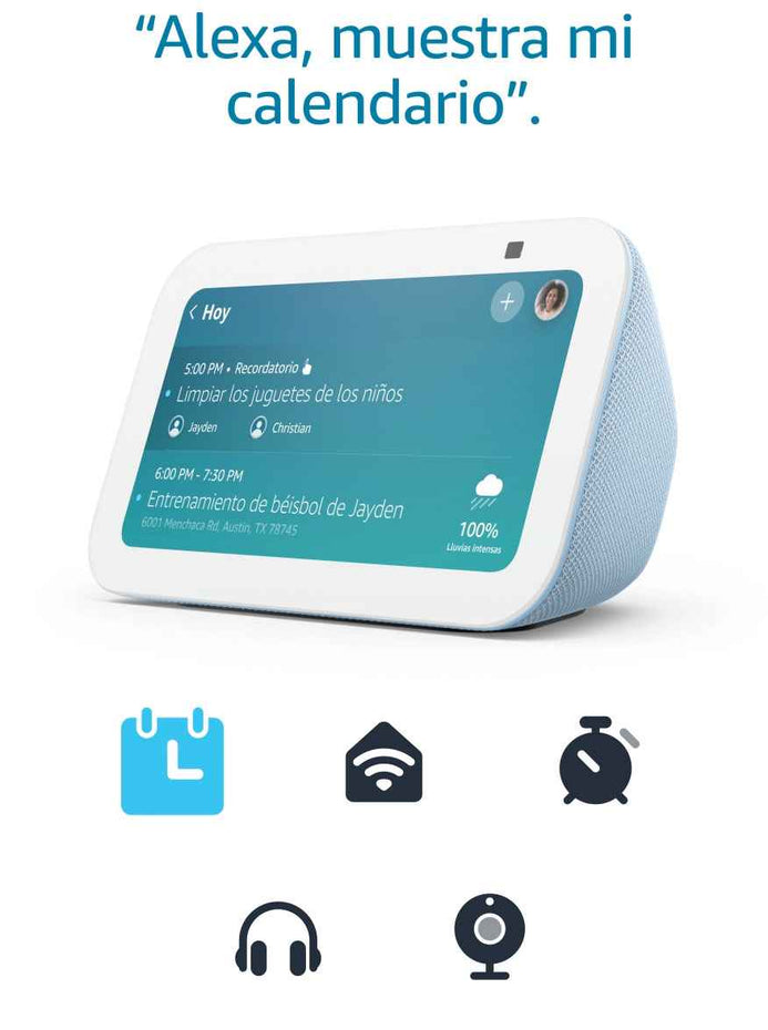 El Amazon Echo Show 5 (Gen 3) combina la potencia de Alexa con una pantalla táctil de 5,5 pulgadas, ideal para mantenerte conectado, informado y entretenido. Perfecto para tu mesa de noche, sala o cocina, ahora en un elegante color Celeste (Cloud Blue).