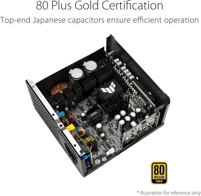 The TUF Gaming Gold features efficient, low-ESR Japanese capacitors to ensure efficient operation — affording it 80 PLUS Gold status. This means it delivers up to 92% efficiency, resulting in less heat, reduced fan noise, and increased reliability.