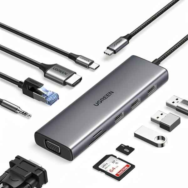 Hub UGREEN CM498 USB-C 10 en 1 con HDMI, VGA, RJ45, USB 3.0, lector SD/TF, AUX y carga PD 100W. Transferencias hasta 5Gbps.