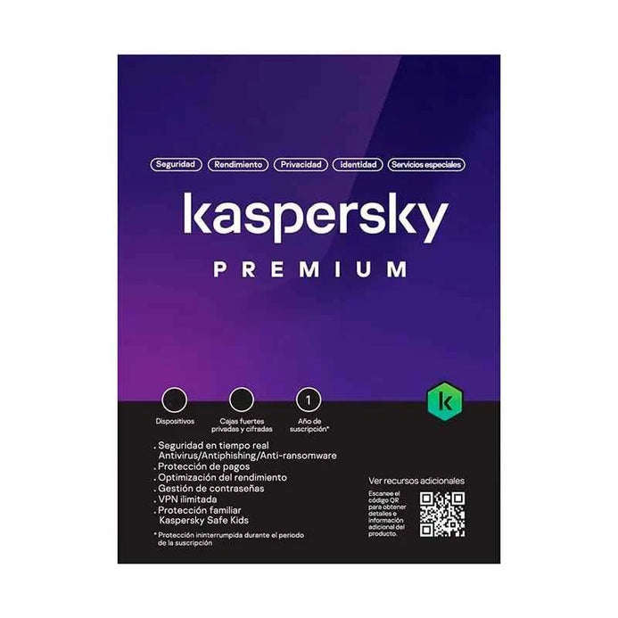 icencia Kaspersky Premium 3 Dispositivos / 1 Año – KPRE031 es la versión más completa de la familia de productos de Kaspersky, diseñada para ofrecer una protección de ciberseguridad de nivel superior, ideal para quienes buscan seguridad, privacidad, rendimiento y asistencia técnica avanzada, todo en un solo paquete.