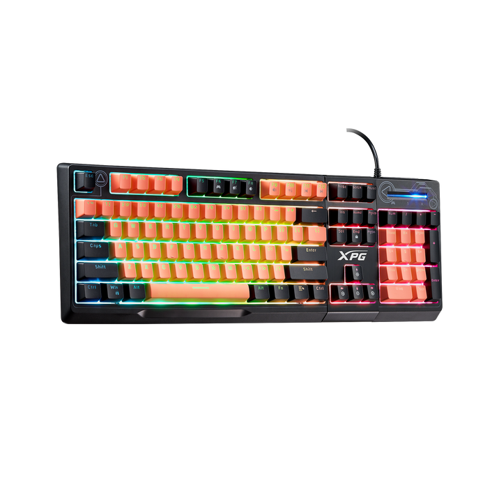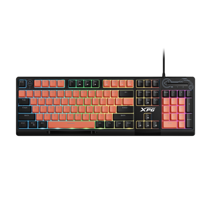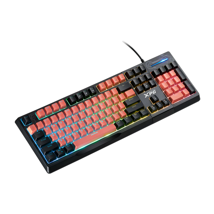 Es un teclado de juegos diseñado para ofrecer una experiencia de juego inmersiva y eficiente. Este teclado combina el diseño tradicional de teclado de membrana con la sensación táctil de un diseño de teclado mecánico, proporcionando un toque suave y acolchado junto con una respuesta de clic satisfactoria. Además, incluye 9 modos de iluminación predefinidos y 12 zonas de iluminación RGB, permitiendo una personalización completa a través del software XPG PRIME.