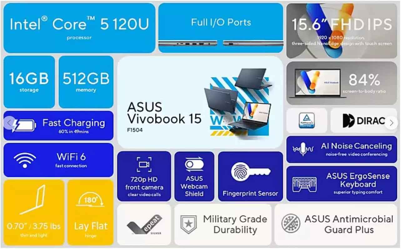 LAPTOP ASUS VIVOBOOK 15 15.6" CORE 5-120U 16GB 512GB WIN 11 INGLÉS 90NB13Y2-M01D40 GRIS